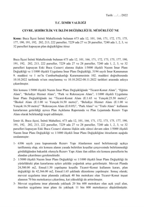 İl Başkanı Yücel'in sosyal medya üzerinden yaptığı çağrıda şu ifadelere yer aldı: "Buca Cezaevi alanının betonlaşmasına dur demek için ,Bakanlığın hazırladığı imar planına itirazın son 2 günü. İzmir'e ve yeşile sahip çıkacak tüm İzmirlileri itiraz etmeye davet ediyorum. İtiraz dilekçeleri Çevre ve Şehircilik İl Müdürlüğü önünde partililerimizce dağıtılacaktır."