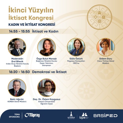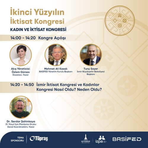 Gazeteci ve yazar Özlem Gürses’in akışını yöneteceği ve moderatörlüğünü Index Grup Yönetim Kurulu Başkanı Erol Bilecik’in üstleneceği öğleden sonraki ikinci bölümün açılışı İzmir Büyükşehir Belediyesi Başkanı Tunç Soyer ve BASİFED Yönetim Kurulu Başkanı Mehmet Ali Kasalı tarafından yapılacak. Tarih, demokrasi, ekoloji ve inovasyon alanlarında kadınların iktisattaki yeri ve önemi üzerine gerçekleştirilecek çeşitli oturumlarda Dr. Serdar Şahinkaya, Özge Bulut Maraşlı, Güliz Öztürk, Didem Duru, Bekir Ağırdır, Doç. Dr. Özlem Kaygusuz, Raziye İçtepe Akyol, İrem Oral Kayacık, Burak Aydın, Zehra Öney, Elvan Ünlütürk, Nilay Kökkılınç, Buket Uzuner, Mert Fırat gibi değerli konuşmacılar bulunacak.