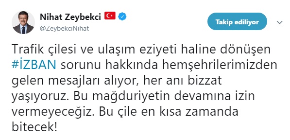 Nihat Zeybekci, 10 Aralık'ta başlayan ve 29'uncu günü geride bırakan raylı sistemle yolcu taşımacılığı yapılan İZBAN'daki grevle ilgili, sosyal medya hesabı Twitter'da paylaşımda bulundu. Zeybekci, konuyla ilgili birçok mesaj aldıklarını belirtti. Nihat Zeybekci, "Trafik çilesi ve ulaşım eziyeti haline dönüşen İZBAN sorunu hakkında hemşehrilerimizden gelen mesajları alıyor, her anı bizzat yaşıyoruz. Bu mağduriyetin devamına izin vermeyeceğiz. Bu çile en kısa zamanda bitecek" ifadelerini kullandı.