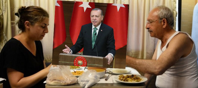 Kemal Kılıçdaroğlu’nun adalet yürüyüşü esnasında karavan içinde atletle yemek yerken çekilen fotoğrafını eleştiren Cumhurbaşkanı Erdoğan, görüntüyü trajikomik olarak değerlendirdi. Erdoğan, “İşte sözde adalet yürüyüşü yapıyor birisi. Ankara’dan çıkmış İstanbul’a yürüyor. Arada sırada karavana oturuyor ve atletle yemek yiyor. Bugün de baktım ki bir gazete başlık atmış, ‘vatandaş ’ filanca. Bu benim vatandaşıma hakarettir. Benim vatandaşım böyle, hele hele ana muhalefetin başında olacak, çağıracak gazeteciyi, ‘gel benim bu fotoğrafımı çek’ ve ondan sonra da ‘ben Atatürk’ün partisinin başıyım’ Sen Atatürk’ü böyle atletle yemek yerken görüp te resim çektirdiğine şahit oldun mu, böyle bir şey var mı? Bunlar trajikomik görüntüler. Onlar şimdi bu görüntülerle zavallı hale düşüyorlar. Milletim onlara gereken dersi vakti geldiğinde en güzel şekilde verdi, yine verecek” dedi.