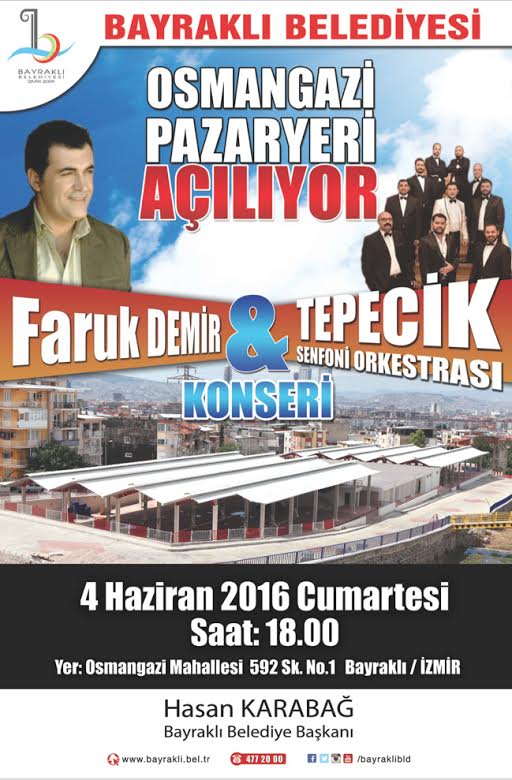 Göreve geldiğinden bu yana ilçeye birçok pazar yeri kazandırdıklarını belirten Bayraklı Belediye Başkanı Hasan Karabağ, “Osmangazi Mahallemize çok büyük ve ihtiyaca yanıt verecek kapalı pazar yeri projesini hayata geçirdik. Buranın açılışını cumartesi günü gerçekleştireceğiz. Tepecik Senfoni Orkestrası ve değerli sanatçı Faruk Demir bir konser verecek. Tüm hemşehrilerimizi açılışımıza bekliyoruz” dedi.