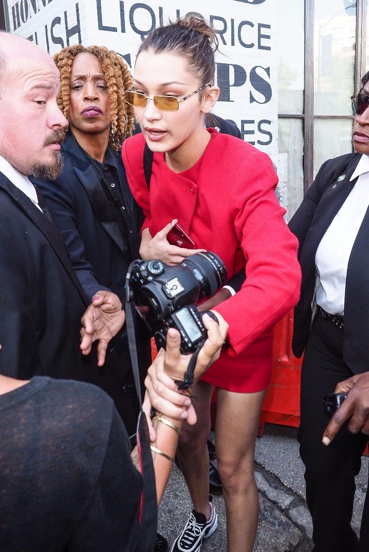 Gigi Hadid'in korumalığını üstlenen görevlilerden biri ünlü modeli görüntülemeye çalışan bir kadın fotoğrafçıyı iterek engellemek istedi. O anda da Bella Hadid korumaya bağırarak müdahale etti. Hadid koruma görevlisine "Hey" Lütfen ona dokunma" dedi. Koruma "Kim o" diye sorunca Hadid cevap vermeden yoluna devam etti.