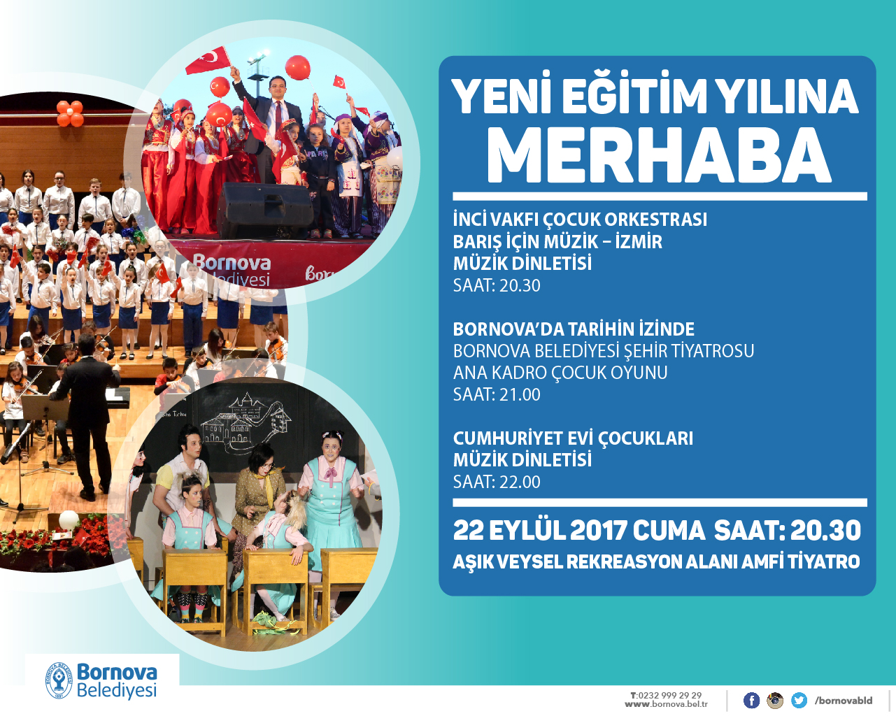 22 Eylül Cuma günü saat 20.30’da Aşık Veysel Rekreasyon Alanı’ndaki Amfitiyatro’da Cevdet İnci Eğitim Vakfı Barış için Müzik Çocuk Orkestrası ve Bornova Belediyesi Cumhuriyet Evi Çocukları konser verecek, ‘Bornova’da Tarihin İzinde’ isimli tiyatro oyunu sahnelenecek.