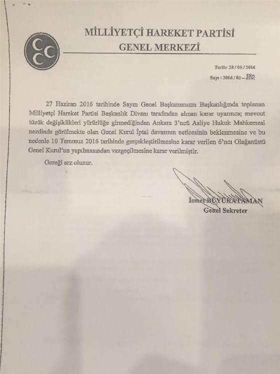 Devlet Bahçeli'nin MHP'nin Olağanüstü Kurultayı'nı 10 Temmuz olarak açıklamasının ardından 10 Temmuzda gerçekleşmeyen kurultayın nedeni ortaya çıktı. Haber 3 Hilal isimli haber sitesinin ortaya çıkardığı belgelerde MHP'nin YSK'ya başvuru yaparak kongreden vazgeçtiği ortaya çıktı.