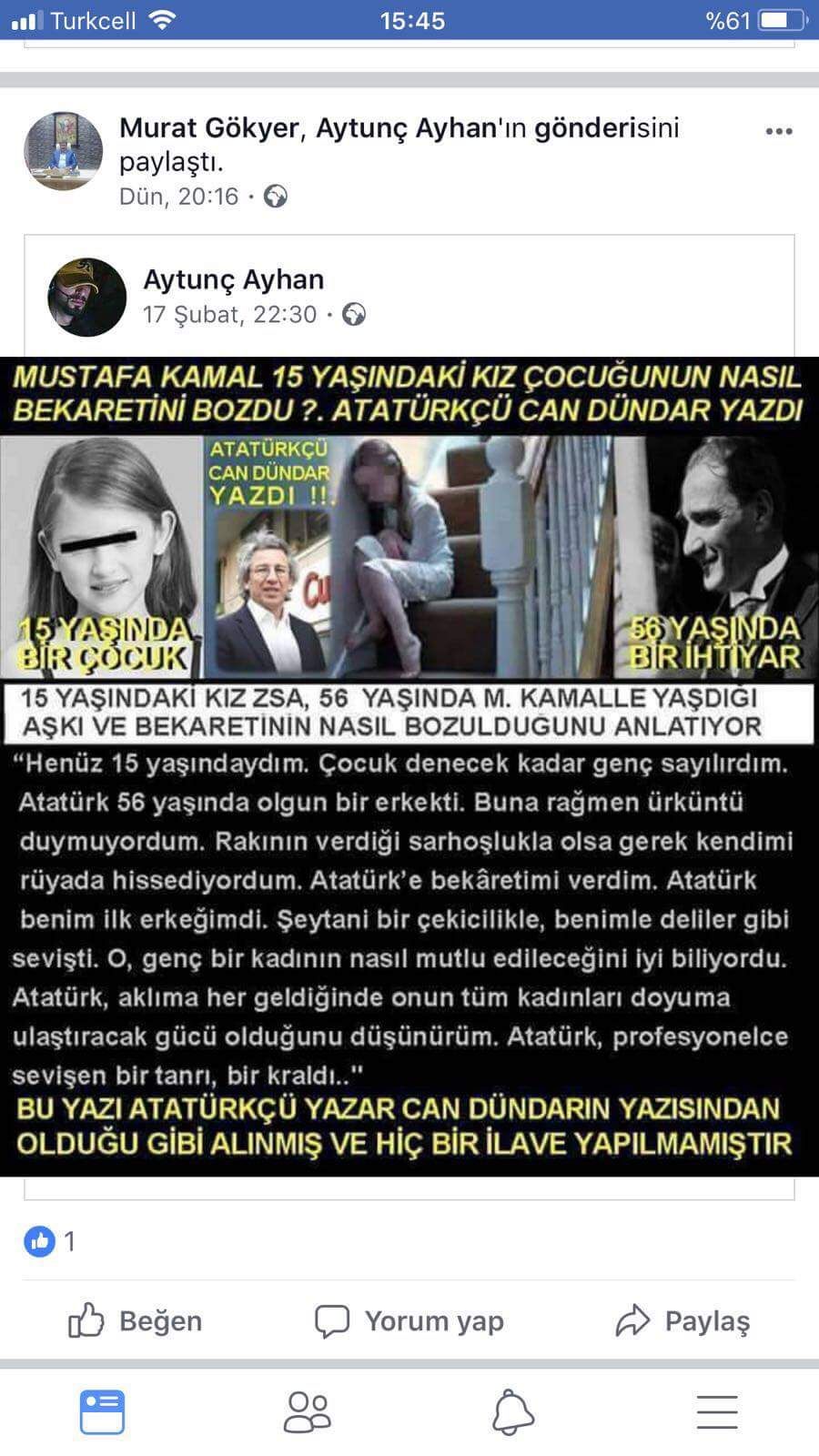 Buca Çaldıran Mahallesi Muhtarı Murat Gökyer Ulu Önder Mustafa Kemal Atatürk ile ilgili çirkin bir paylaşımda bulundu. Can Dündar’ın yazısı olduğu iddia edilerek yapılan paylaşıma CHP Buca örgütünden büyük tepki geldi.