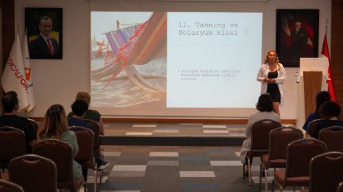 Hastane konferans salonunda gerçekleştirilen etkinlikte, cilt kanserinin türleri, risk faktörleri, korunma yolları ve düzenli deri kontrollerinin önemi detaylı bir şekilde ele alındı. Güneşin zararlı etkileri, solaryum kullanımı, genetik yatkınlık gibi faktörlerin cilt sağlığı üzerindeki etkilerini anlatan Dr. Özkapu, katılımcılara görseller eşliğinde bilgilendirici bir sunum yaptı.