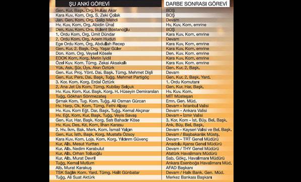 Listenin başında, darbe gecesi hainler tarafından rehin alınan Genelkurmay Başkanı Hulusi Akar’ın isminin yanındaki bölümün ‘BOŞ’ bırakıldığı görüldü. Yine listenin ikinci sırasında yer alan Kara Kuvvetler Komutanı Salih Zeki Çolak’ın da atandığı yerin ‘BOŞ’ bırakıldığı dikkat çekti. Darbe girişimi sonrası rahatsızlığı nedeniyle görevi bırakan Jandarma Genel Komutanı Galip Mendi ve darbe girişimi soruşturması kapsamında tutuklanan 2. Ordu Komutanı Adem Huduti’nin isimlerinin karşısında ise ‘Devam’ yazıldığı belirlendi. Genelkurmay 2. Başkanı Yaşar Güler, 1. Ordu Komutanı Ümit Dündar, Ege Ordu Komutanı Abdullah Recep ve Özel Kuvvetler Komutanı Zekai Aksakallı’nın ise darbecilerin atama listesinde bulundukları görevlerden alınıp Kara Kuvvetler Komutanlığı emrine verildikleri tespit edildi.