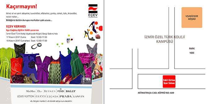 Ege Çağdaş Eğitim Vakfı İkinci El Kermesi 17 Kasım Cuma günü Uşakizade Köşkünde saat 12’de kapılarını ondördüncü kez açacak. Abiyeler, takım elbiseler, paltolar, ceketler, çantalar, süs eşyaları ve küçük ev eşyalarının yer alacağı kermeste dünyaca ünlü yerli ve yabancı markaların ikinci el ürünleri uygun fiyatla satışa sunulacak.