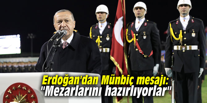 Jandarma ve Sahil Güvenlik Akademisi Stadyumu'nda gerçekleşen, "Jandarma ve Sahil Güvenlik Akademisi İkinci Dönem Sözleşmeli Astsubay Mezuniyet Töreni"nde konuşan Cumhurbaşkanı Erdoğan, Münbiç'in etrafında hendekler kazıldığını bildiklerini belirterek, “Mezarlarını hazırlıyorlar” ifadelerini kullandı.