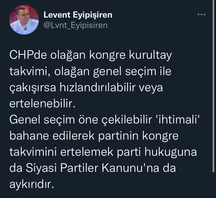 “CHP’de olağan kongre kurultay takvimi, olağan genel seçim ile çakışırsa hızlandırılabilir veya ertelenebilir. Genel seçim öne çekilebilir 'ihtimali' bahane edilerek partinin kongre takvimini ertelemek parti hukukuna da Siyasi Partiler Kanunu'na da aykırıdır.”