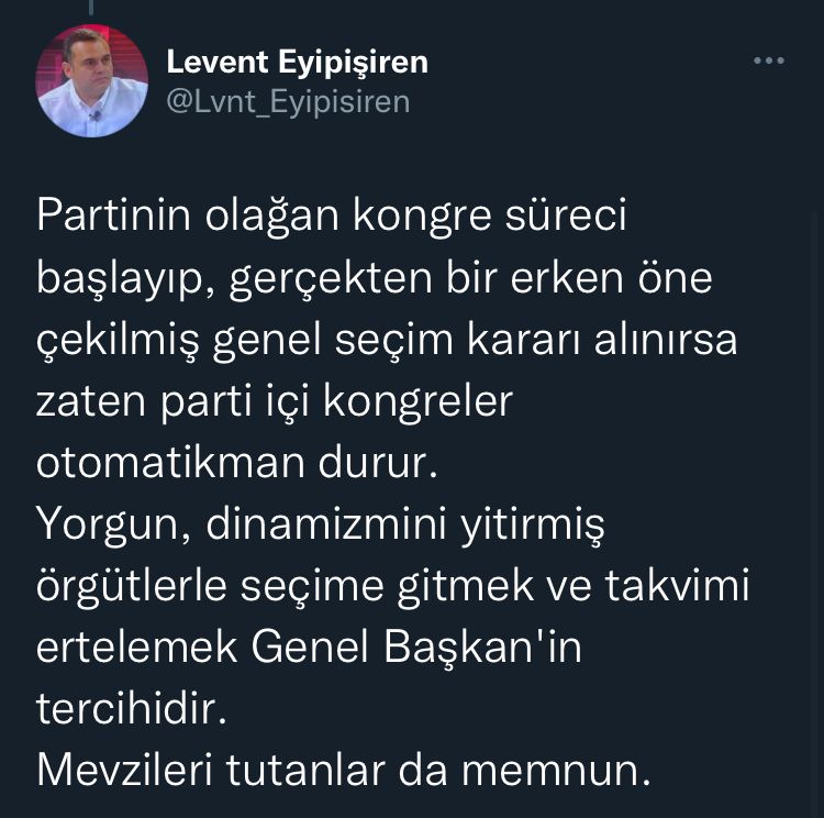 CHP Parti Meclisi Eski Üyesi Levent Eypişiren, sosyal medya hesabı üzerinden CHP’nin erken seçim olması ihtimali üzerine kurultayı 1 yıl erteleme kararına tepki gösterdi. Kararın parti hukukuna ve Siyasi Partiler Kanunu’na aykırı olduğunu öne süren Eypişiren, bunun genel başkanın tercihi olduğunu söyledi.