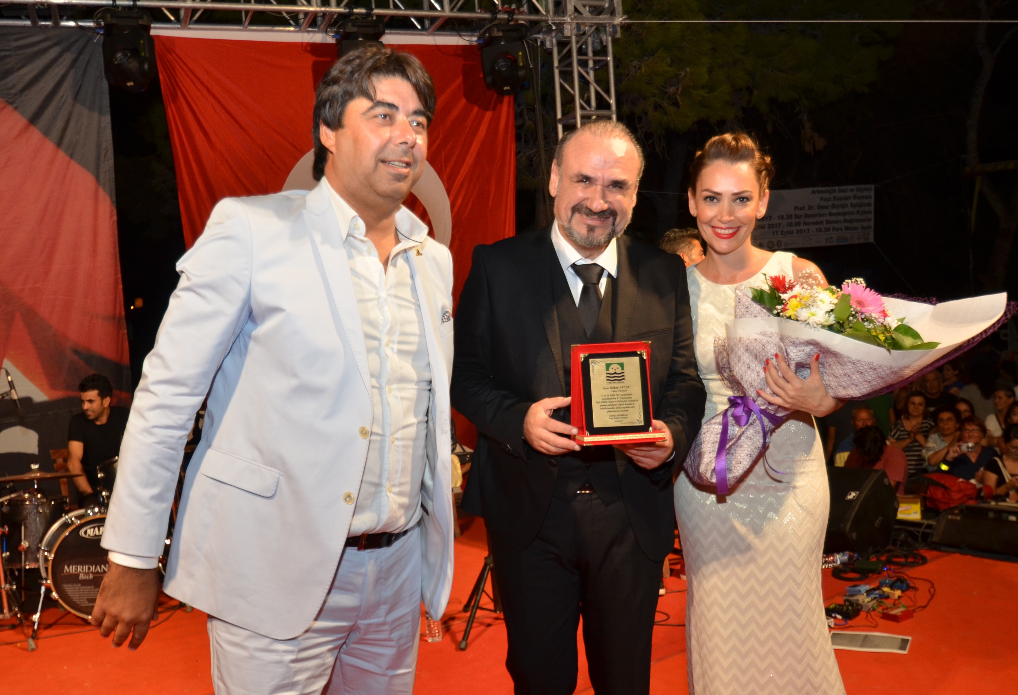 Foça Belediye Başkanı Gökhan Demirağ, Hakan Aysev ve birlikte sahne aldığı eşi Banu Aysev’e teşekkür çiçeği ve plaket sundu.