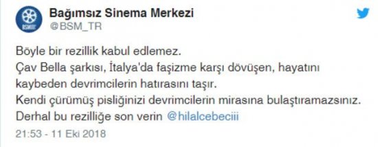 Bağımsız Sinema Merkezi yaptığı paylaşımda, “Böyle bir rezillik kabul edilemez. Çav Bella şarkısı, İtalya’da faşizme karşı dövüşen, hayatını kaybeden devrimcilerin hatırasını taşır. Kendi çürümüş pisliğinizi devrimcilerin mirasına bulaştıramazsınız. Derhal bu rezilliğe son verin” ifadelerini kullandı.