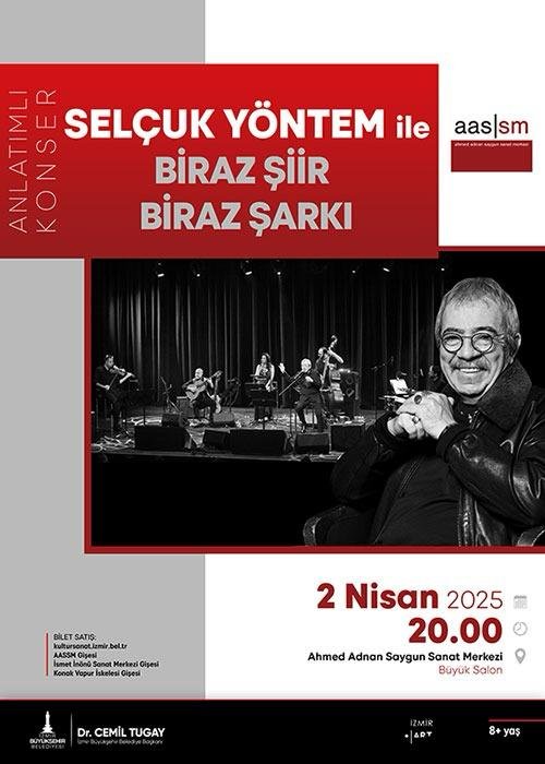 Usta oyuncu ve sunucu Selçuk Yöntem, 2 Nisan Çarşamba günü saat 20.00’de Ahmed Adnan Saygun Sanat Merkezi Büyük Salon’da Biraz Şiir Biraz Şarkı adlı anlatımlı konser düzenleyecek. Konserde Selçuk Yöntem’le cazın ritminde şiirle dolu bir yolculuğa çıkılacak. Dünya prömiyeri Londra’nın en prestijli sahnelerinden Cadogan Hall’da gerçekleştiren özel etkinlik, birçok şairin eserlerini özgün caz besteleriyle buluşturuyor. Selçuk Yöntem’in etkileyici sesi ve yorumuyla canlanacak şiirler, quartetin olağanüstü müzikalitesiyle birleşerek seyirciye unutulmaz anlar yaşatacak.
