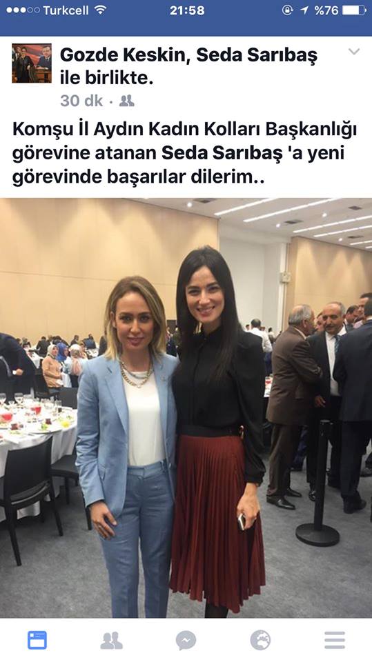 Keskin, Facebook profilinden Binali Yıldırım'ın katılımıyla gerçekleştirilen ve Ankara'da düzenlenen "İl Başkanları İftar Programı'nda" Seda Sarıbaş ile beraber çekildikleri fotoğrafı paylaşan Gözde Keskin, "Komşu İl Aydın Kadın Kolları Başkanlığı görevine atanan Seda Sarıbaş'a yeni görevinde başarılar dilerim" notunu düştü.