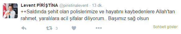 Buca Belediye Başkanı Levent Piriştina Şırnak'ın Silopi ilçesinde polis aracının geçişi sırasında teröristlerce yola döşenen patlayıcının infilak ettirilmesi sonucu 4 kişi öldü, 5'i polis 20'ye yakın kişi de yaralanmasının ardından Başkan Piriştina “Saldırıda şehit olan polislerimize ve hayatını kaybedenlere Allah'tan rahmet, yaralılara acil şifalar diliyorum.. Başımız sağ olsun dedi
