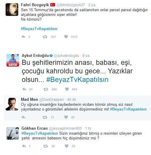 Twitter'da '#BeyazTvKapatılsın' etiketiyle binlerce mesaj yazılırken, AKP'li Twitter hesaplarından da tepkilerin yükselmesi dikkat çekti.