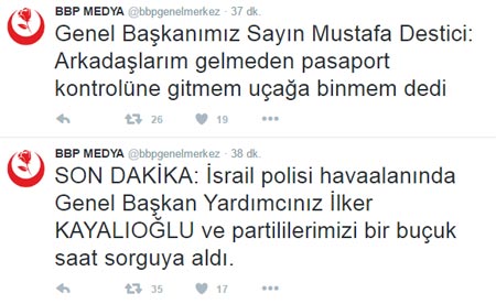 Konu ile ilgili BBP Medya'nın Twitter hesabından atılan tweette ''SON DAKİKA: İsrail polisi havaalanında Genel Başkan Yardımcınız İlker KAYALIOĞLU ve partililerimizi bir buçuk saat sorguya aldı.Genel Başkanımız Sayın Mustafa Destici: Arkadaşlarım gelmeden pasaport kontrolüne gitmem uçağa binmem dedi'' ifadelerine yer verildi.