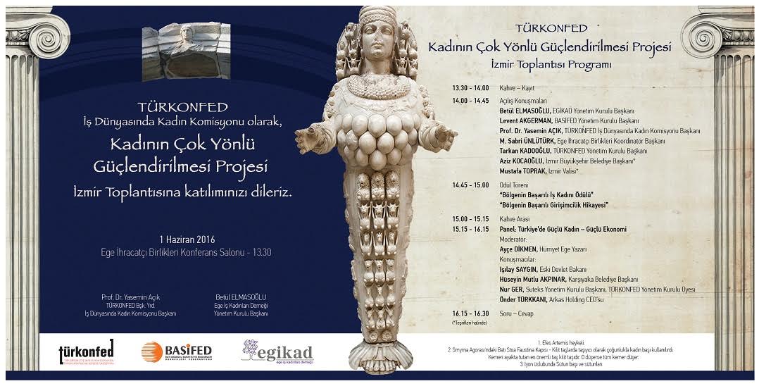 “Kadının Çok Yönlü Güçlendirilmesi Projesi İzmir Toplantısı” 1 Haziran Çarşamba günü Türkiye Girişim ve İş Dünyası Konfederasyonu(TÜRKONFED), Batı Anadolu Sanayici ve İşadamları Dernekleri Federasyonu (BASİFED), Ege İş Kadınları Derneği (EGİKAD) işbirliği ile Ege İhracatçılar Birliği Konferans salonunda gerçekleştirilecek.