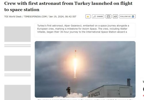 Times of India da, Türkiye’nin tarihi yolculuğunu “Türkiye'nin ilk astronotu Alper Gezeravcı'nın Avrupalı mürettebatla uzay yolculuğuna başlaması bir dönüm noktası oldu” diyerek okuyucularıyla buluşturdu. Haberde sık sık Türkiye'nin ilk astronotuna vurgu yapılırken, mürettebatın Uluslararası Uzay İstasyonu’nda 2 hafta kalacağı kaydedildi.