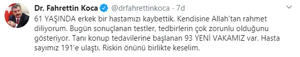 Sağlık Bakanı Koca, sosyal paylaşım sitesi Twitter hesabından yaptığı paylaşımda, "61 yaşında erkek bir hastamızı kaybettik. Kendisine Allah'tan rahmet diliyorum. Bugün sonuçlanan testler, tedbirlerin çok zorunlu olduğunu gösteriyor. Tanı konup tedavilerine başlanan 93 yeni vakamız var. Hasta sayımız 191'e ulaştı. Riskin önünü birlikte keselim" dedi.