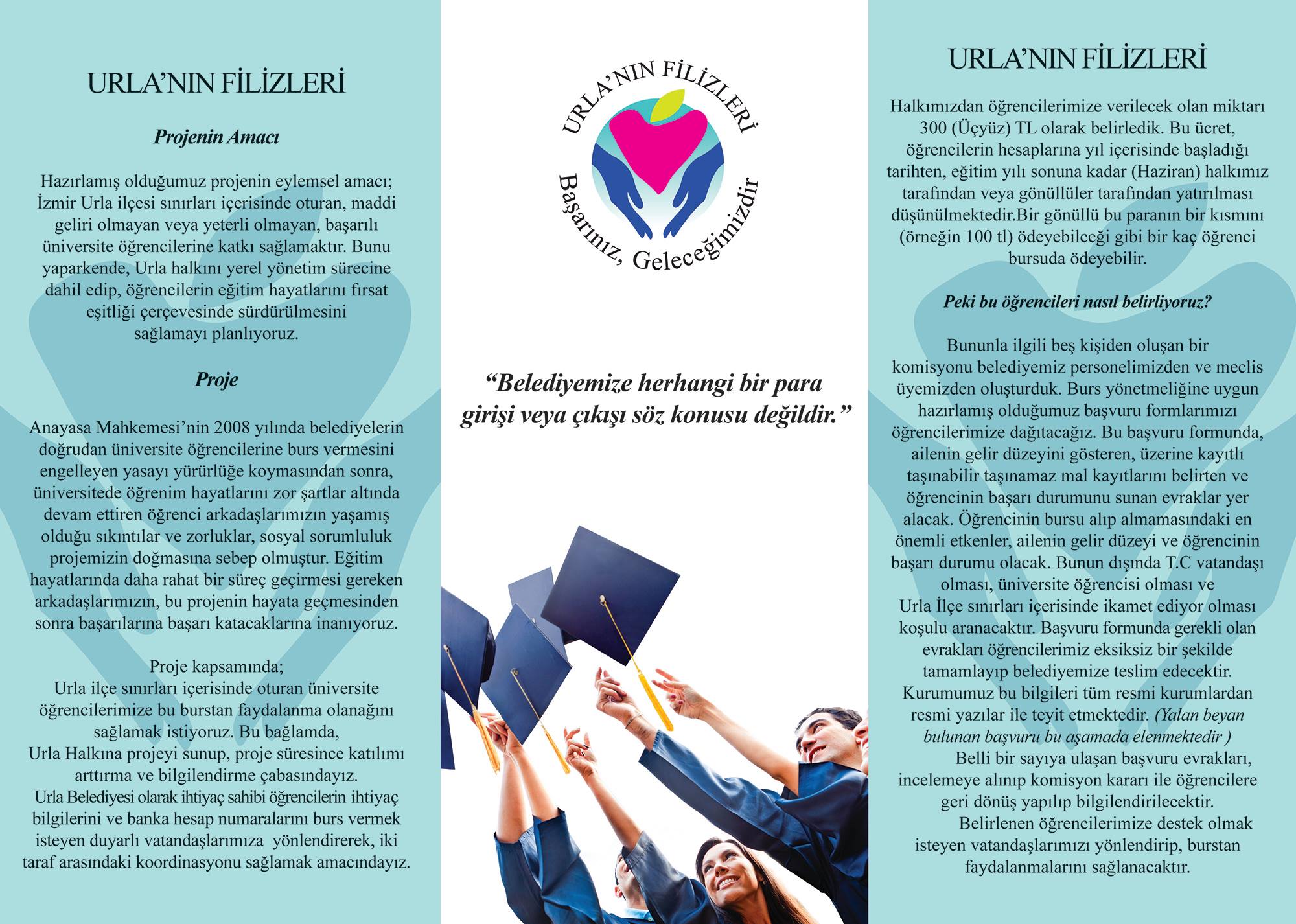 Belediye Başkanı Sibel Uyar'ın geçen yıl eğitimde fırsat eşitliği yaratmak hedefiyle yola çıktığı “Urla’nın Filizleri” projesi için kampanyayı anlatan broşürler hazırlandı.